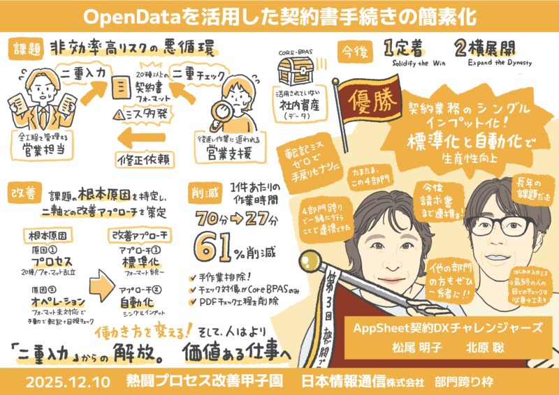 昨年に引き続き、NI+Cの社内イベント「業務改善プロジェクト(プロセス甲子園)」にて、グラフィックレコーディング(グラレコ)を担当させていただきました。