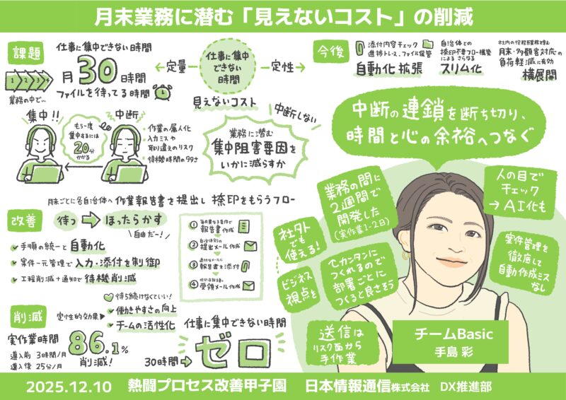 今回は各チーム、課題や背景、改善のためのプロセス、結果、今後といった内容でポイントを絞って可視化しました。
