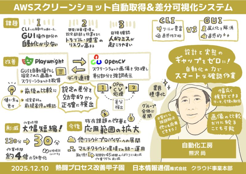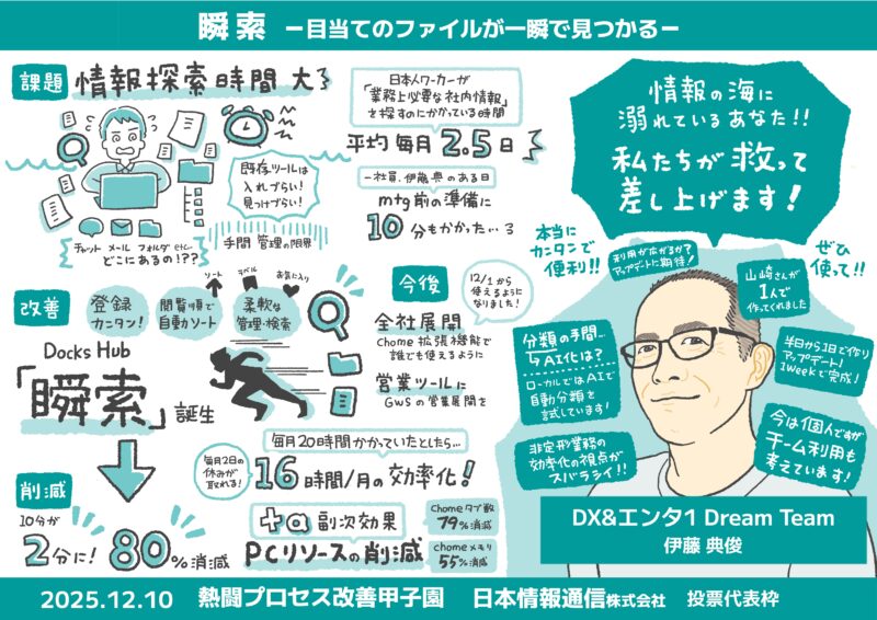 今回のイベントでも、NI+Cの全国から集まった各チームによる熱意あふれる業務改善の成果を発表者の似顔絵付きでグラレコとしてチームごとに仕上げました。